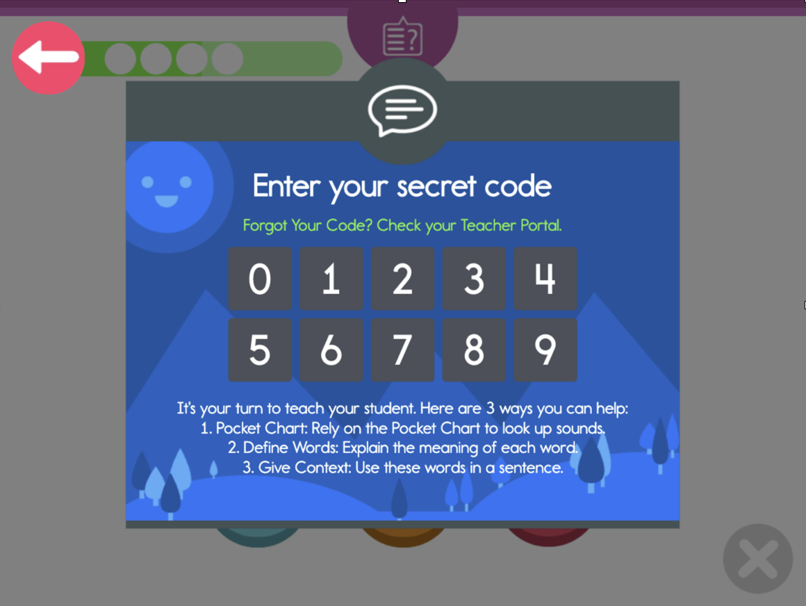When a student makes three mistakes in a row in a particular exercise, a Lock will disable the program. To remove the Lock, click on the back arrow at the top-left corner of the screen. Have your child try the lesson again, but please sit with your child and offer support when they need it. We list three ways you can help your child on the bottom of the Lock. Here is what it says: